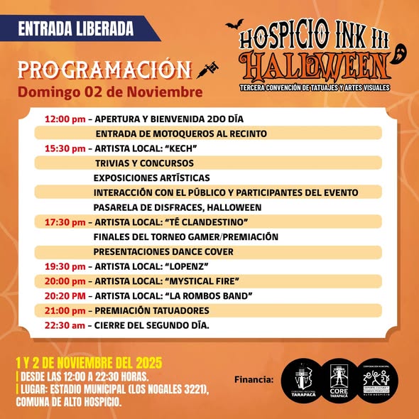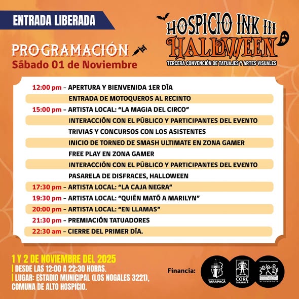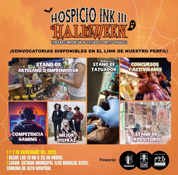 La tercera versión de Hospicio Ink III Halloween llegará este 1 y 2 de noviembre al Estadio Municipal de Alto Hospicio con una mezcla explosiva de arte, música, disfraces y cultura urbana. Más de diez horas diarias de espectáculos gratuitos para celebrar la creatividad, la piel y la expresión libre.
