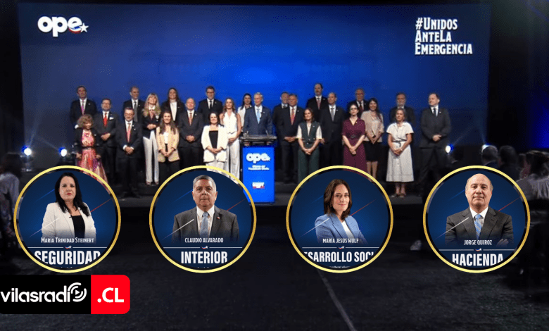 El eje de seguridad pública será dirigido por la abogada María Trinidad Steinert en el Ministerio de Seguridad, apoyada por Fernando Barros en Defensa y Fernando Rabat en Justicia. En infraestructura, el gabinete incorpora nombres de alto perfil técnico como el arquitecto Iván Poduje en Vivienda, el ingeniero Louis de Grange en Transportes, la senadora Ximena Rincón en Energía y el exministro Juan Carlos Jobet en Obras Públicas.
