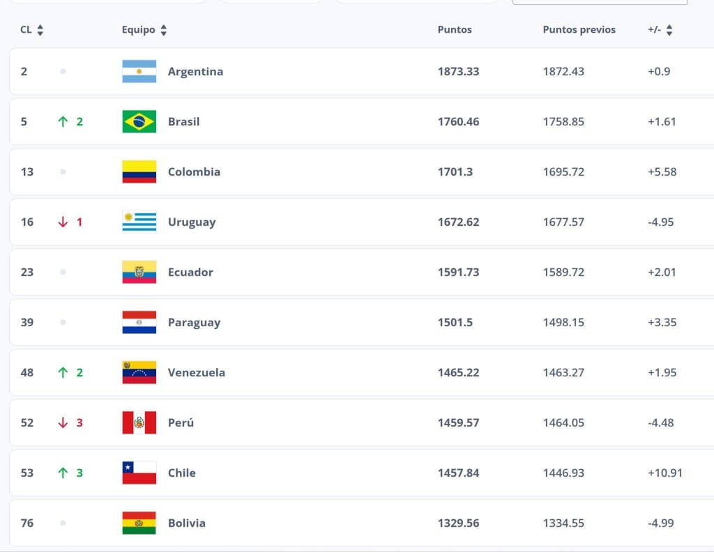 En tanto, a nivel sudamericano, Chile se mantiene en el penúltimo puesto, ubicándose únicamente por encima de Bolivia (N° 76) entre las diez selecciones de la región.