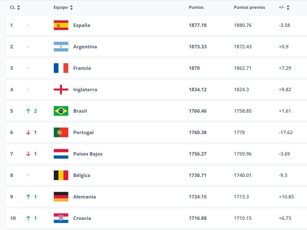 A nivel mundial, España encabeza la clasificación con 1877,19 unidades, seguido de Argentina en la segunda posición con 1873,33 puntos y Francia en el tercer lugar con 1870 unidades.