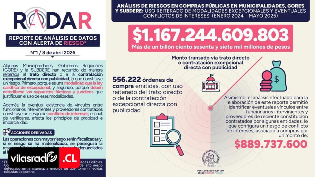La Contraloría General de la República (CGR) presentó oficialmente RADAR (Reporte de Análisis de Datos con Alerta de Riesgo), una nueva herramienta de carácter preventivo que identifica y alerta sobre altos riesgos en los procesos de la Administración del Estado. Su objetivo es detectar situaciones que podrían representar irregularidades en la gestión pública.